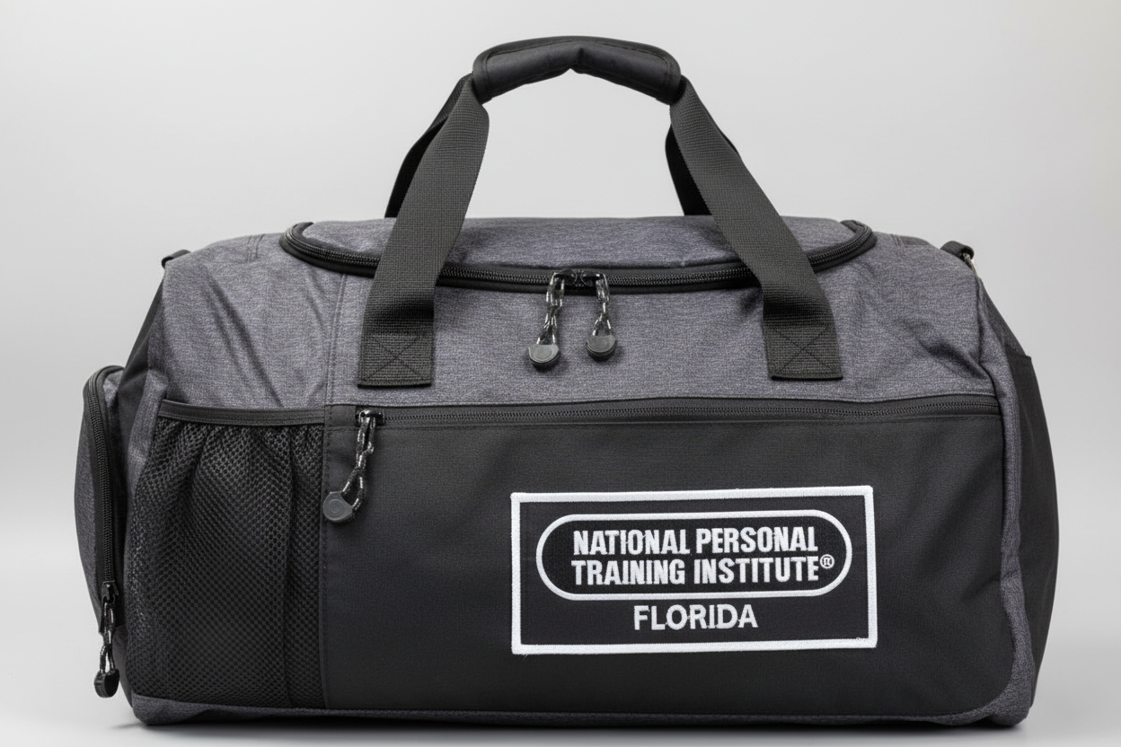 Our NPTI Florida Duffel/Gym Bags are custom travel bags that are perfect for a quick getaway as well as for use around the office, home, or gym. These bags are quite stable and sturdy. Durability comes standard, thanks to the canvas construction. They’re terrific personal trainer bags for travel, as they contain a main zippered compartment for large items, several smaller zippered pockets, and a shoe pocket with a zipper closure. Clothing, toiletries, electronics, snacks, drinks, games, and more can easily be accommodated in the space these travel duffels provide.